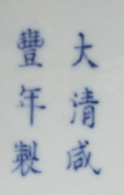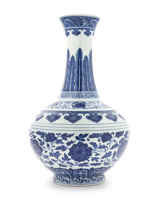 the ovoid body standing on a splayed foot rising to a tall neck and tapering to a flared mouth, the main body decorated with lotus scrolls above foliage and lappet leaves, below three concentric circles and a band of ruyi heads, the neck with further lotus, a key-fret band and overlapping plantain leaves, the mouth painted with wave motif, bearing a six-character Xianfeng mark in underglaze blue to the underside.