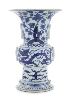 the body of an archaic zun form with a flared mouth and projecting flanges, the bulbous mid-section painted with sinuous five-clawed dragon amongst clouds, above flaming clouds painted to the lower section, and the neck painted with flowering branches.