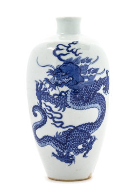 the baluster body rising to a short neck, painted with two crouching five-clawed dragons, bearing a six-character Kangxi mark to the underside.