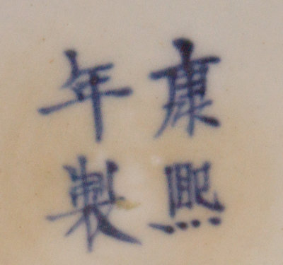 the ovoid body tapering to an incurved foot, painted with prunus blossoms all against a blue ground, bearing a four-character Kangxi mark in underglaze blue to the underside, together with a blue and white vase of tall cylindrical form rising to a flared mouth, the body decorated with two shaped panels enclosing flower-filled vases and precious objects, interspersed with flower heads on a dark blue ground.