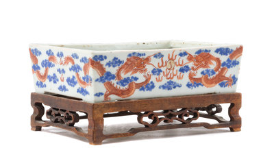 of rectangular form raised on four bracket feet, the exterior decorated with two pairs of confronting dragon amongst clouds chasing the gilt highlighted flaming pearl of wisdom, the cavetto painted with floral scroll, all raised on a rectangular wood stand with openwork decoration.