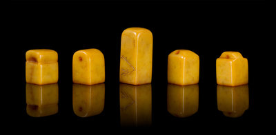 of various forms, one simply carved to the front with bamboo and a two-character maker's mark, the others having plain sides with the same maker's mark, fitted in a hardwood box.