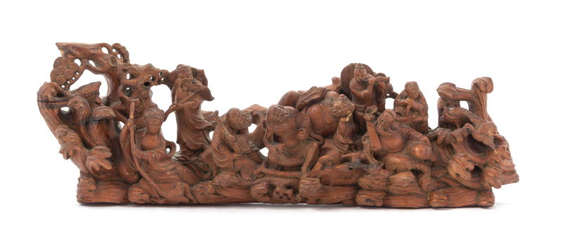 intricately carved to depict eight immortals in various pursuits and pine trees, all above breaking waves.
