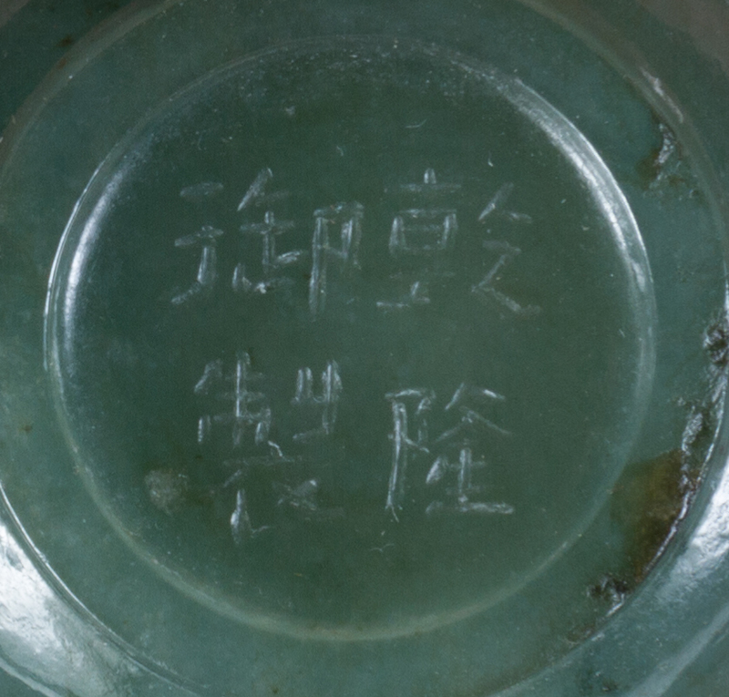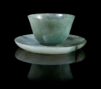 the small footed wine cup and saucer of a celadon stone with dark green inclusions, both bases incised with a four-character Qianlong mark.