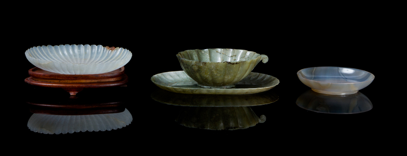 the first a Mughal-style chrysanthemum dish of a near-white stone, raised on a hardwood stand, the second a spinach jade cup and saucer, having lobed outlines, the cup with a scrolled handle, together with a banded agate circular dish, raised on a circular foot ring. (3 items)