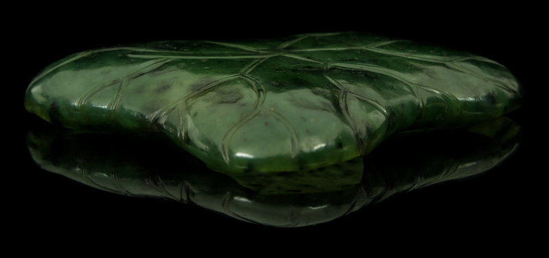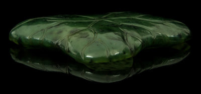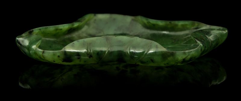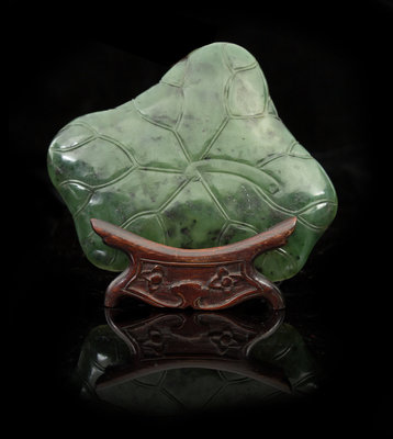 the dark green stone having black specks, carved in the form of a lotus leaf, raised on a hardwood stand.
