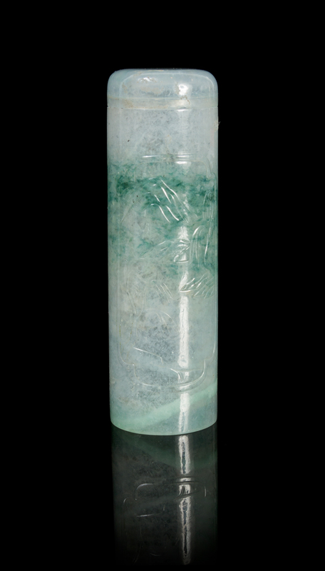 the translucent body suffused with white and green inclusions, both sides carved with two shaped panels, one enclosing a riverscape scene with mountains and willow trees, the other having an imperial poem written by Qianlong Emperor.