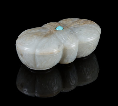the near-white stone having light brown inclusions and black specks, of floriform, the cover carved in low relief depicting two floral stems facing opposite directions, the center with a circular blue hardstone inset.