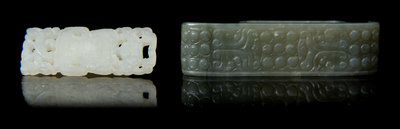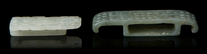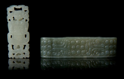 the first a celadon stone carved with stylized beast masks and raised bosses, the second a pale celadon stone incised with shuangxi ("double happiness") character.