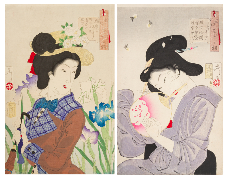 Ureshiso Meiji nenkan tokon geigi no fuzoku (Happy: Habits of a modern geisha of the Meiji era) and Sanpogashitaso Meiji nenkan saikun no fuzoku (Strolling: Habits of the wife of a nobleman of the Meiji era) from the series Fuzoku sanjuni-so (Thirty-two Aspects of Women), 1888 (two works).