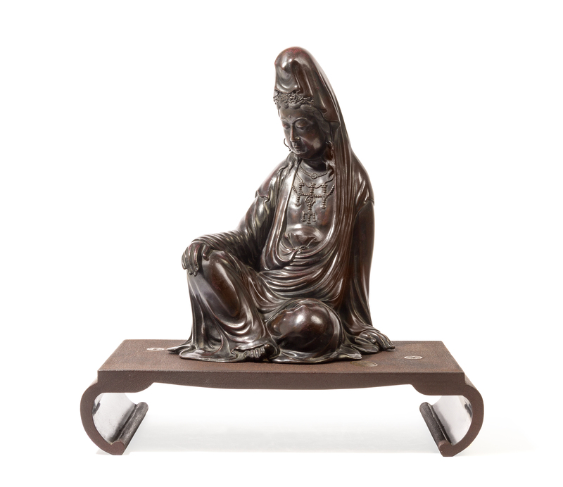 the figure depicted seated at ease with the right hand resting on the right knee, wearing draped robes and hood, the naked chest adorned with a beaded necklace suspending a pendant, raised on a rectangular hardwood stand.