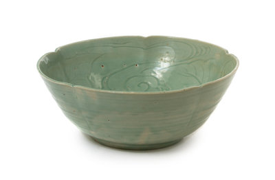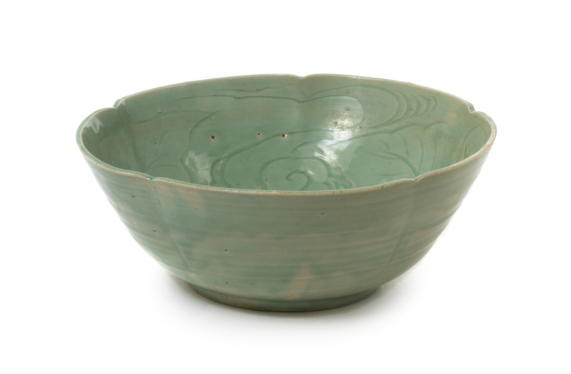 having a scalloped mouth rim, the interior incised with a central medallion enclosing floral design, circled by leafy branches.