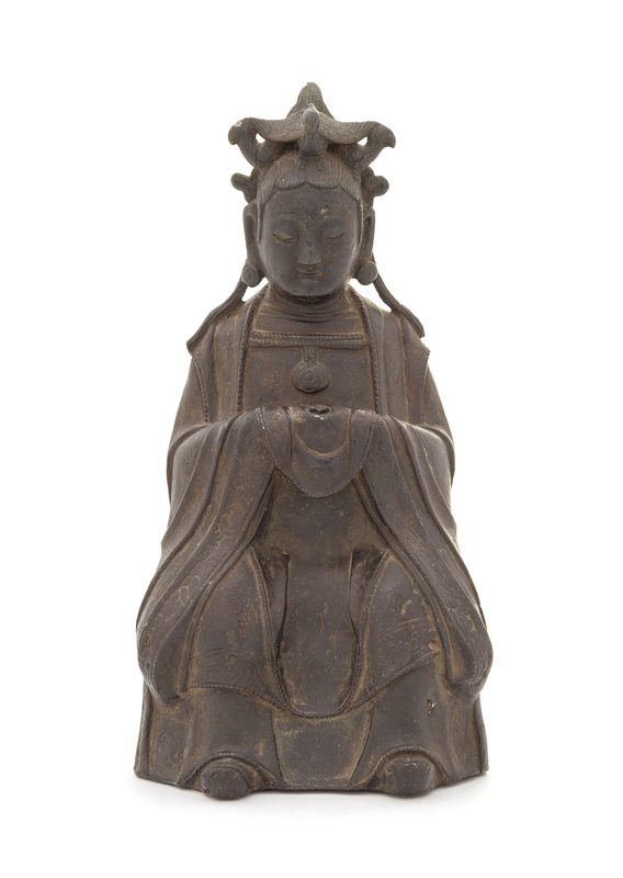 the figure depicted sitting on a naturalistically cast base with both handsclasped in front of the chest, wearing draped robes and an elaborateheaddress, the face with a serene expression.