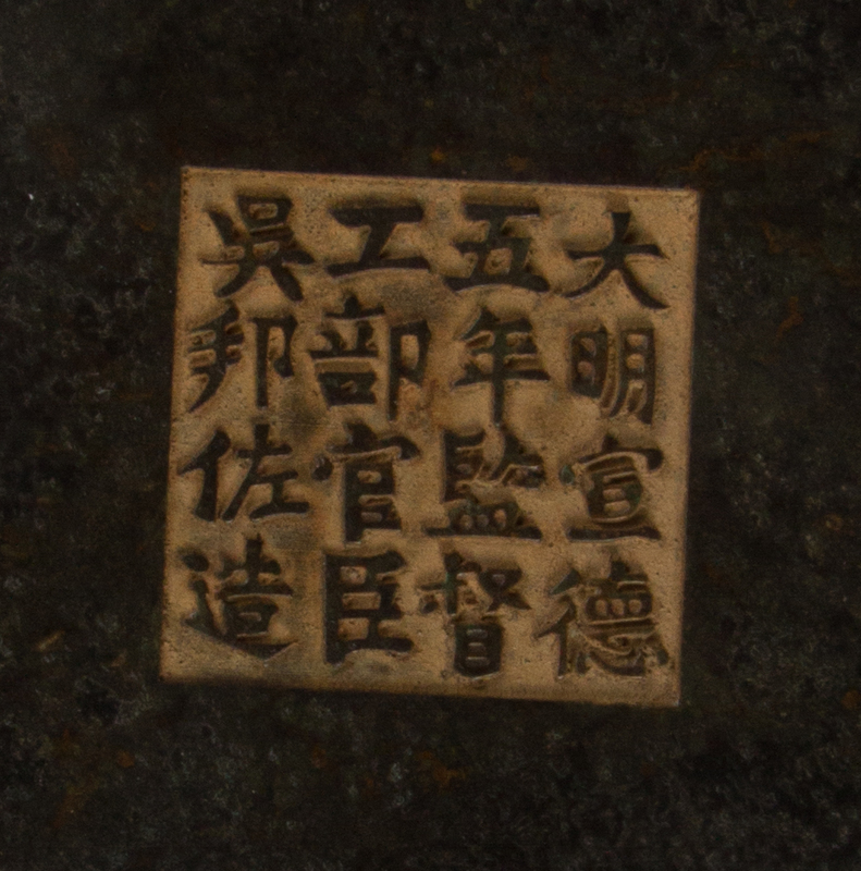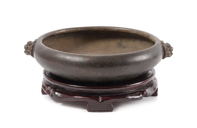 the compressed circular body flanked by a pair of lion-mask handles,the base impressed with a maker's mark within a square panel, raised on a fitted hardwood stand.
