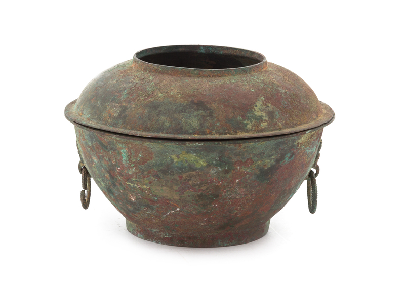 the compressed ovoid body flanked by a pair of beast masks and loose ring handles.