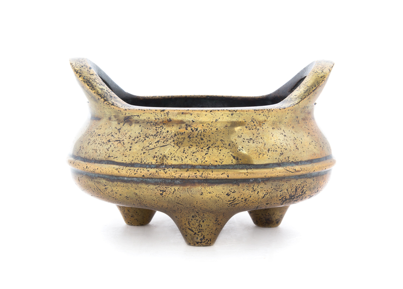 the circular body cast with a raised ring and having two arched handles, the base impressed with shi gu zhi bao mark.
