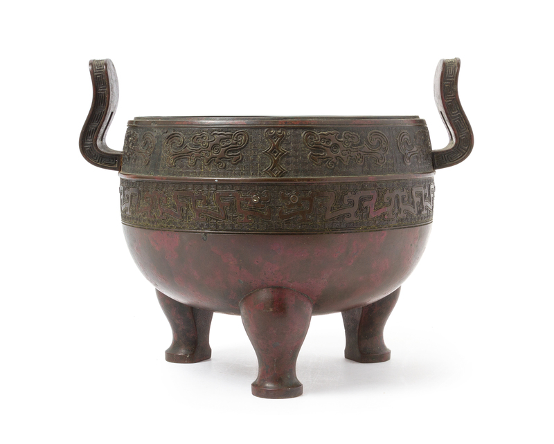 the compressed ovoid body decorated with confronted kuilong and stylized dragons against a leiwen ground, flanked by a pair of upright curved handles having key-fret borders, raised on three curved supports.