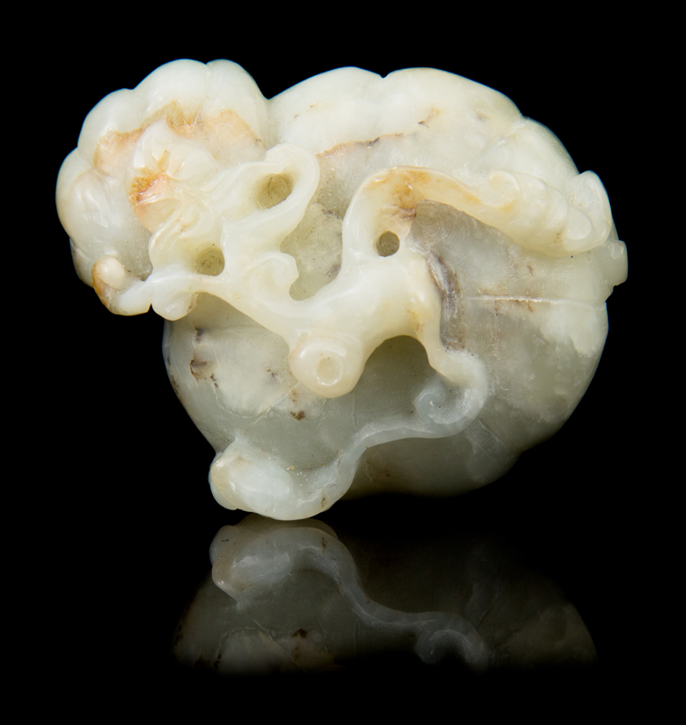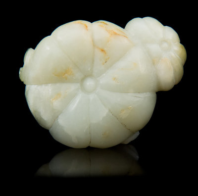 the mottled celadon stone carved as two pumpkins joined by leafy branch.