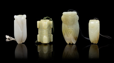 three pendants carved to depict cicadas, the fourth in the shape of cong.