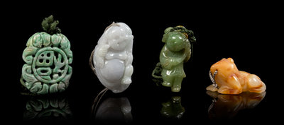 the first a white and russet jade example carved as a recumbent frog, the second a green jade example depicting a child bearing a flower branch in hands, the third a white jadeite figure of Budai Buddha, the fourth a green and white jadeite reticulated pendant carved with fu character enclosed by bats.