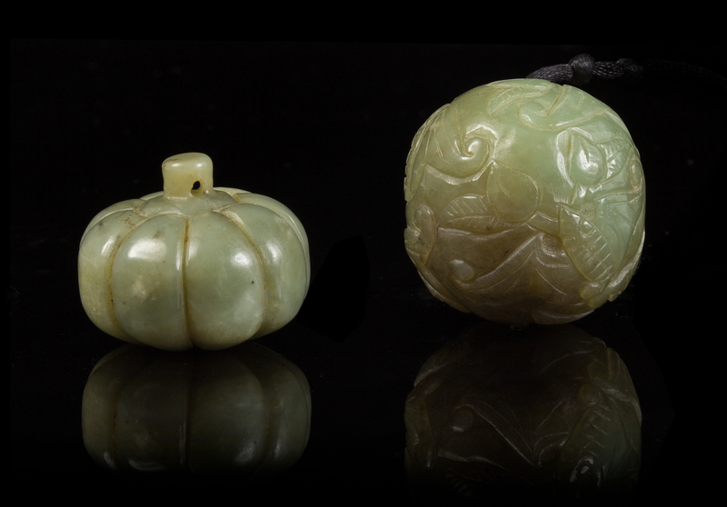 each of a celadon stone, the first carved as a pumpkin, the second with bat decoration.