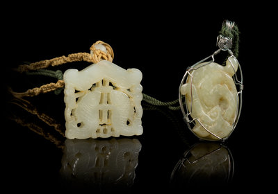 each stone of a celadon tone, the first pierced and carved to depict double fish under a chime, the second in the form of a crouching chilong.