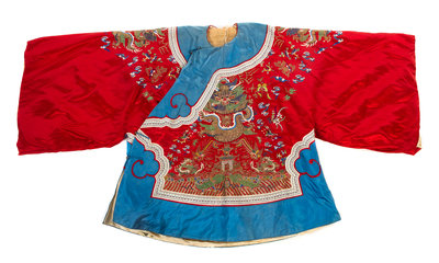 the robe worked in couched gold threads, satin and "Peking knot" stitches on the front and back depicting two forward-facing five-clawed dragons chasing the flaming pearls circled by floral sprays, clouds scrolls, shou character roundels, butterflies, and birds bearing flowers in their beaks, all above a pagoda emerging from lishui waves enclosed by two winged phoenixes, a pair of crouching dragons and two mythical beasts, the shoulders decorated similarly, all reserved on a red ground, having blue borders.