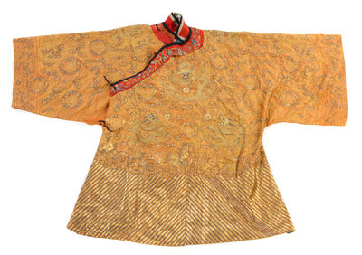 having a gold and silver thread embroidered five-clawed dragon at the center above two sideways facing sinuous dragons amidst clouds and roundels enclosing endless knots, each shoulder having a forward facing dragon, all set atop an apricot silk ground and above gilt stripes, the collar having polychrome embroidery birds, flowering branches, rockery and pavilion with gilt wash bronze buttons.