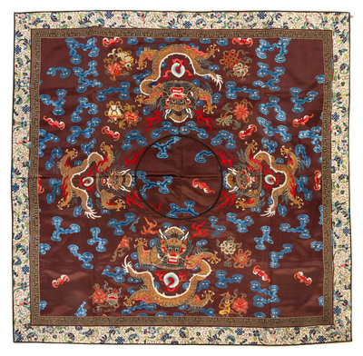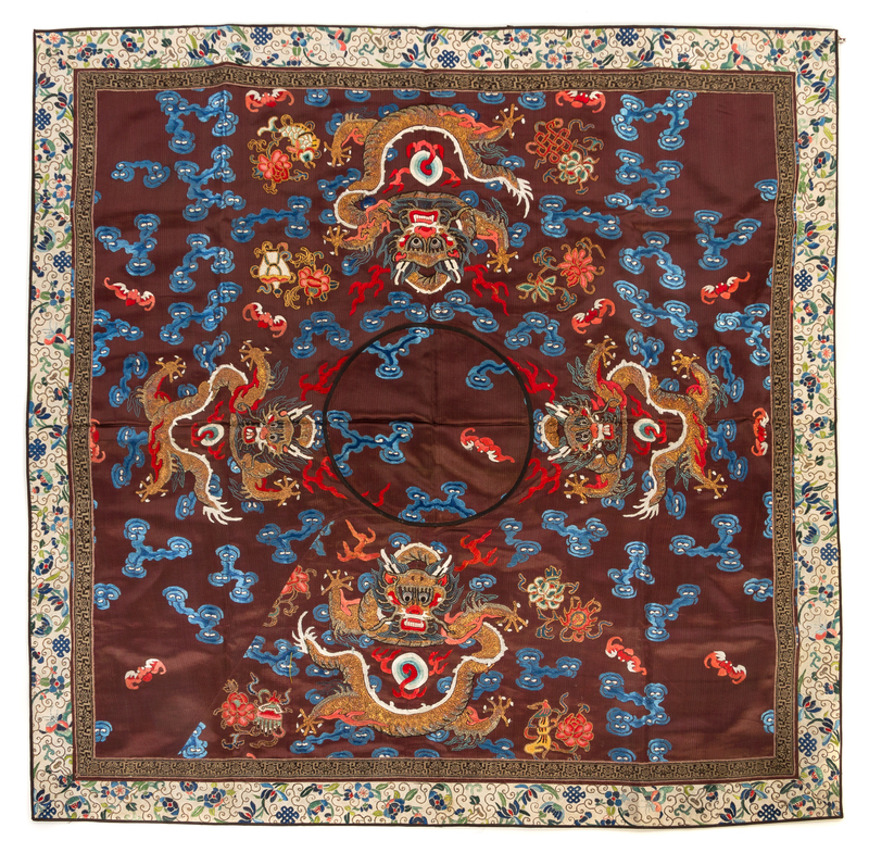 of square form, centered by a roundel circled by four sinuous five-clawed dragons chasing flaming pearls of wisdom, further surrounded by clouds, peony heads and Buddhist emblems, all against a chocolate ground, the borders decorated with floral sprays and endless knots on an ivory ground.