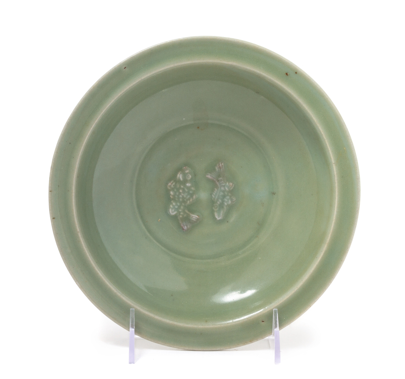 the footed plate having a wide rim, decorated with a central medallion depicting adorsed fish with detailed scales, the body covered in an even light green glaze.