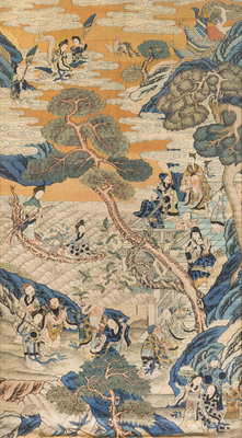 of rectangular form, finely woven to depict Daoist immortals and deities on a garden terrace with pine and peach trees issuing from rockery, the immortal Magu navigating her log raft in a river, with further groups of immortals standing along the shore bearing numerous gifts, all below the clouds with Xiwangmu and her attendants seated atop a phoenix, joining the immortal of longevity, Shoulao and the Eight Immortals with cranes in flight above.