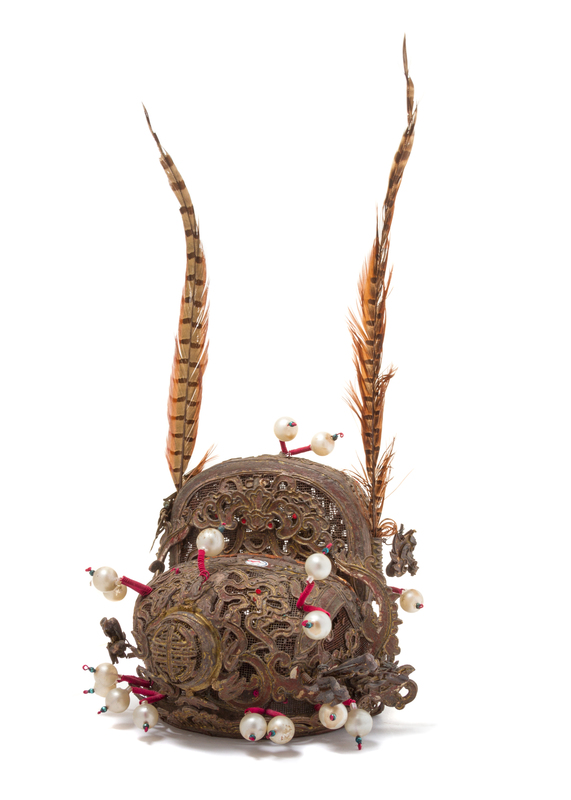 A Chinese Parcel Gilt and Lacquered, King Fisher and Pheasant Feather Decorated Performer's Hat