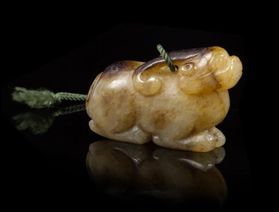 of a yellow stone with dark hues, carved as a recumbent bixie with four legs tucked underneath.