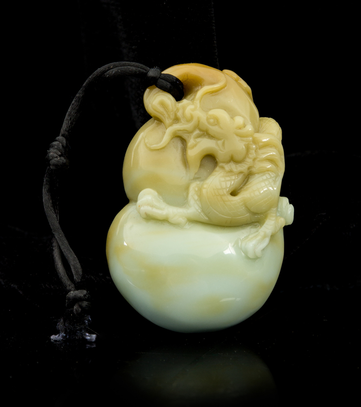 the pale celadon having russet hues, of gourd form, with relief carved dragon decoration set on the upper section.