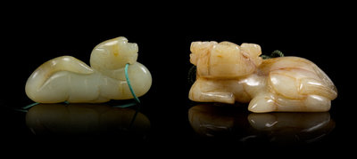 the first a celadon stone carved as a mythical beast in recumbent posture, the second a white and russet stone depicting an ox.