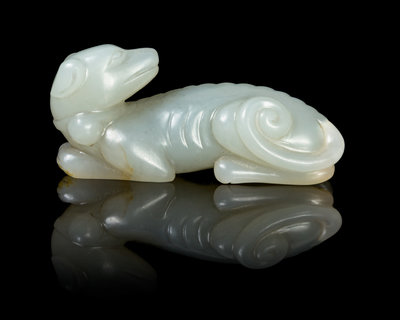 the pale celadon stone with minor russet inclusions, the finely carved recumbent dog depicted with four legs tucked underneath the body with the head turned backwards, the mane falling on both sides of the body and the swirled tail on the left haunch.