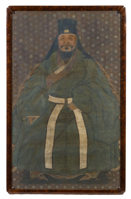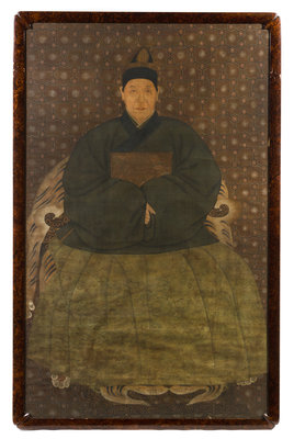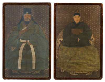 depicting a couple each seated in a horseshoe back armchair, wearing voluminous robes, with a calm expression on the face, the male figure also wearing a scholar's hat, his left hand placed at front while the right hand down, the male figure with her hands folded and hidden in sleeves.