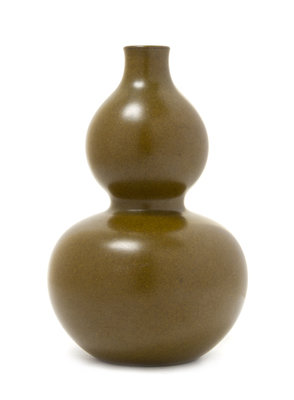 the double gourd form vase rising to a slightly lipped mouth, the whole body evenly covered in a teadust-green glaze, the base impressed with a six-character Qianlong mark.