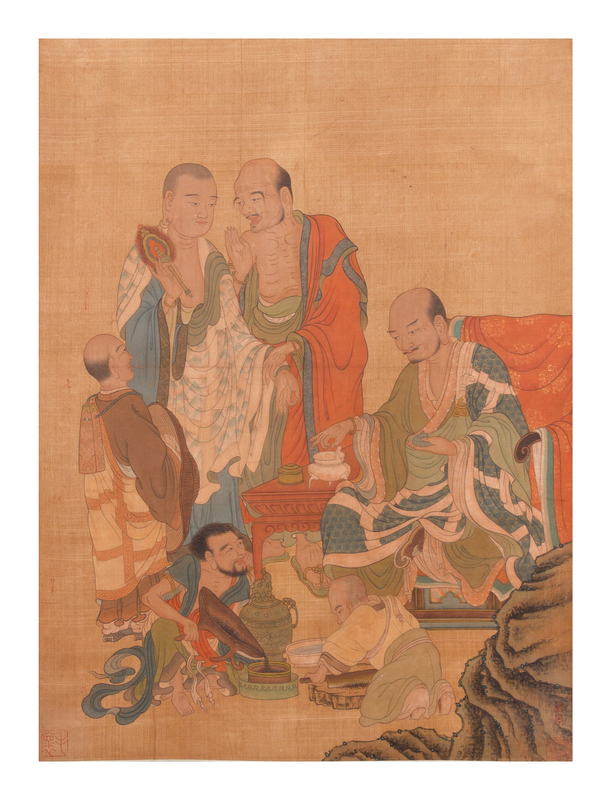 depicting robed Buddha, three luohan figures and two attendants in various pursuits in a garden setting. Having two red seals.