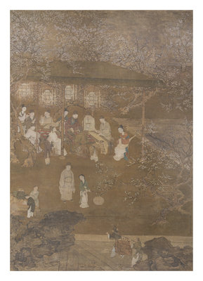 depicting figures in an outdoor rockery and courtyard setting.