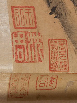 depicting scholars in various leisure pursuits within a mountainous landscape with rushing river, rockery and houses amongst trees, having four red seals.