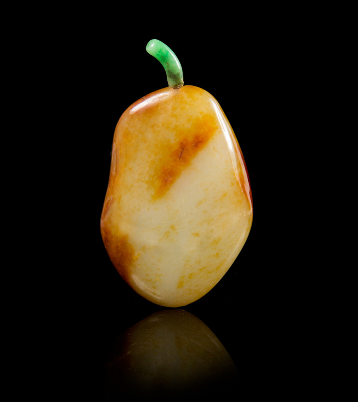of flattened, natural pebble form, of a near-white stone with russet hues, having a apple green jadeite stopper.