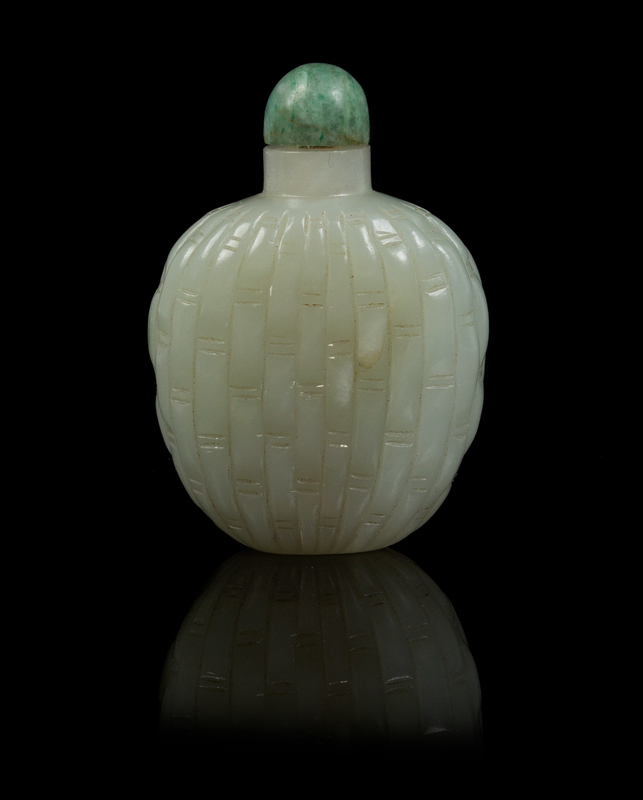 carved throughout depicting basketweave, with a green jadeite stopper.