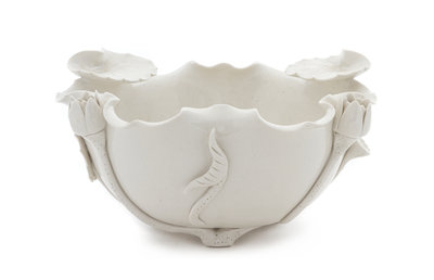 the body in the form of a large lotus leaf with the exterior molded with further lotus leaves and lotus bud rising from the base to the curved mouth rim.