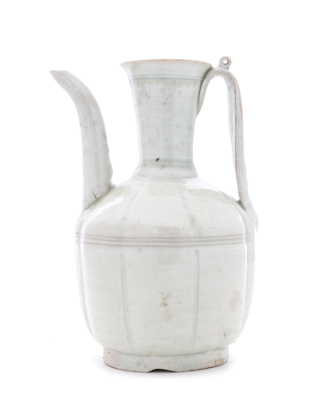 the body of footed, baluster form with lobed lines, rising to a tall neck and a flared mouth, the upper body decorated with three concentric circles, applied with a curved cylindrical spout an arched rectangular handle surmounted by a loop-form finial.