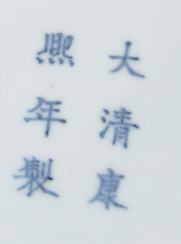 of baluster form with broad shoulders, the interior and the base glazed white, bearing a six-character Kangxi mark in underglaze blue to the underside, raised on a fitted later stand.