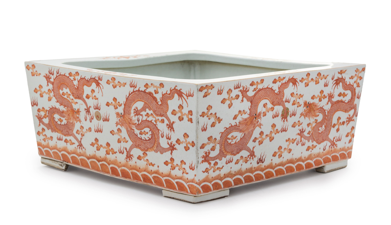 of square form raised on four bracket feet, each side panel painted with two writhing dragons chasing the flaming pearl amid clouds above waves, the wide cavetto with floral sprays, the base unglazed.