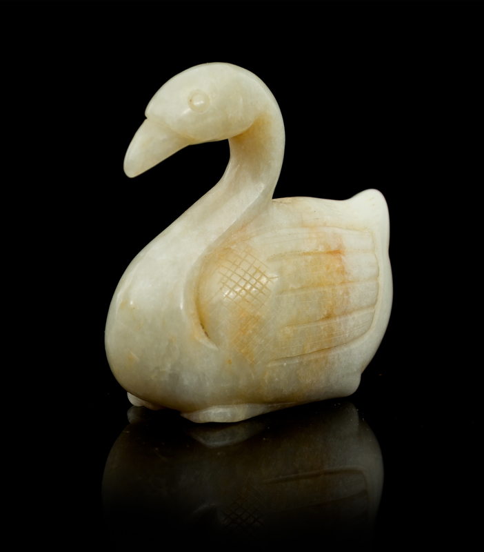 the pale celadon stone having russet patches, carved in the form of a forward-facing duck resting with both legs tucked underneath, the wings with detailed incised feathers.
