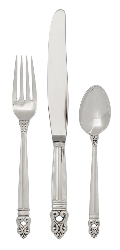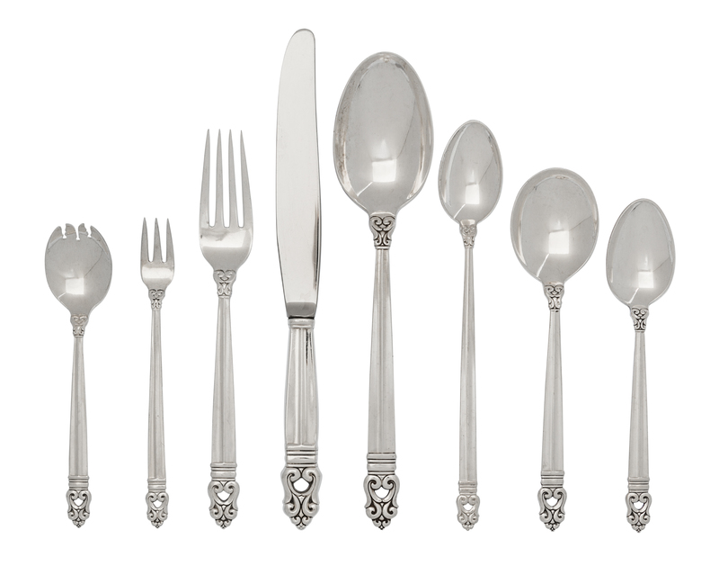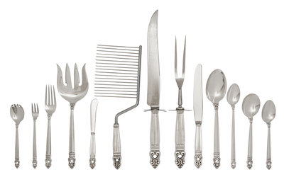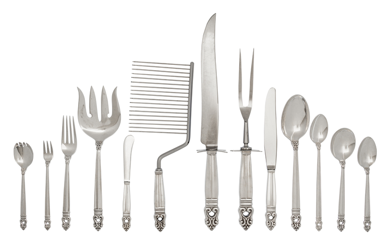 Royal Danish pattern, comprising:13 dinner forks15 salad forks13 butter knives13 dinner knives12 cocktail forks12 dessert forks24 tea spoons16 soup spoons12 iced tea spoons1 baby spoon2 small serving forks1 angel food cake knife1 gravy ladle1 small gravy ladle2 serving spoons1 meat fork1 carving set