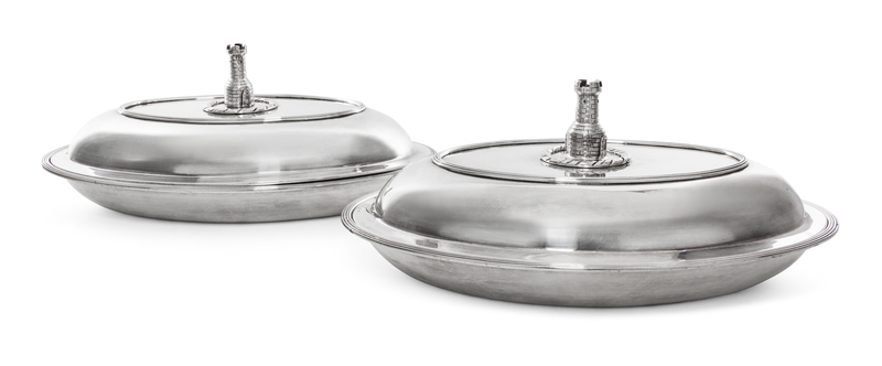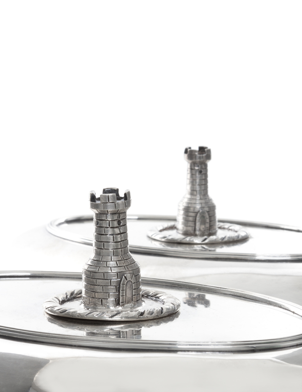 oval with reeded rims, the reversible covers with detachable heraldic finials formed as masonry towers.